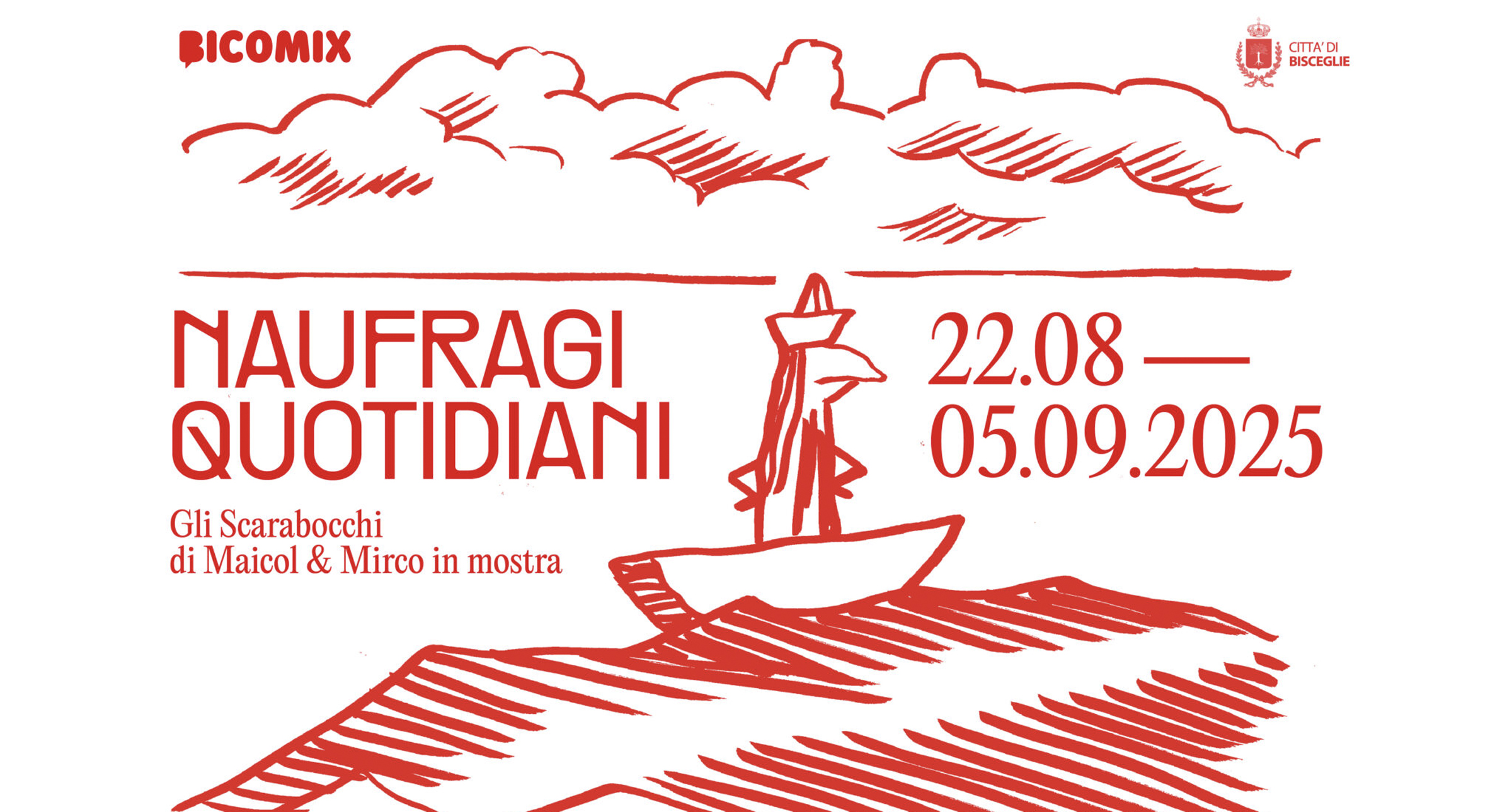 La mostra presenterà al pubblico più di cento tavole originali e vedrà esposte – in anteprima nazionale – trenta tavole inedite da “L’Isolo”, il nuovissimo fumetto di Maicol & Mirco in uscita a settembre per Bao Publishing. Un’intera ala del Palazzo sarà poi dedicata ai suoi iconici Scarabocchi: una “comica tragedia quotidiana” che da sempre, attraverso il paradosso tipico della satira e la capacità di sintesi del fumetto, ci interroga su alcune delle grandi questioni del presente, sollevando dubbi sulla nostra umanità e, soprattutto, sulla nostra “disumanità”. L’iniziativa si inserisce nella campagna “R1PUD1A” di Emergency, a cui ha aderito anche il Comune di Bisceglie. Attraverso la vendita delle tavole originali che saranno esposte per l’occasione, verranno raccolti fondi da donare a Emergency per sostenere le sue attività.